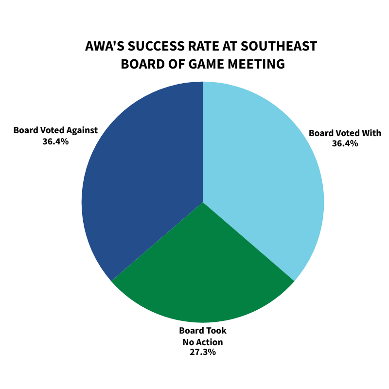 Overall, AWA submitted comments on 44 proposals. Of those, the Board ‘took no action’ on 12 proposals we commented on.
